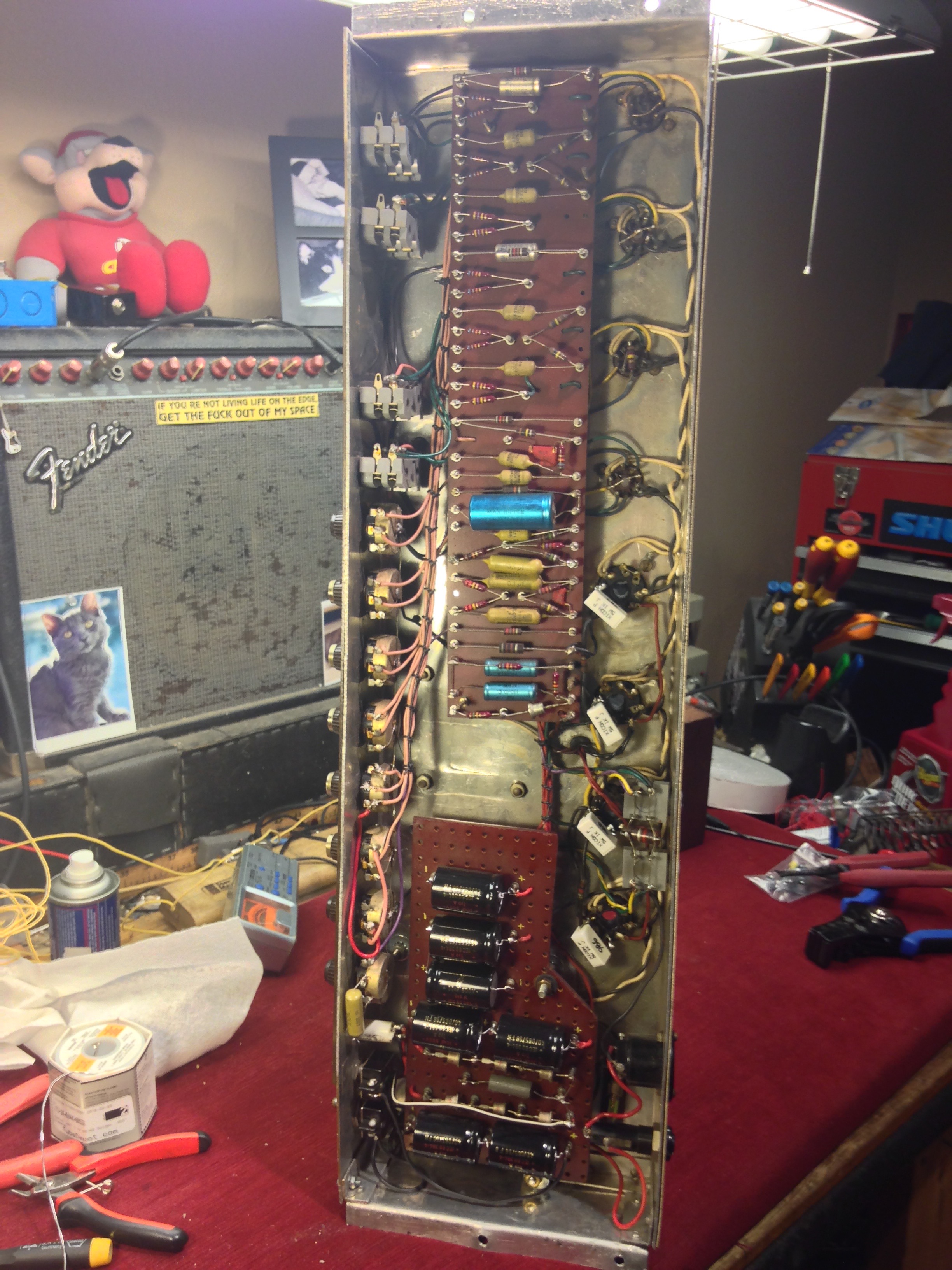 image Published at 2448 × 3264 in Historical Amplifiers, Part 1 -1965 Marshall Super PA owned by Pete Townshend « Previous Next » Here is a stand up portrait of the entire interior of the chassis. If you look closely you will notice that all other original parts, not mentioned previously, are still present. This amp has a whole lot of original mojo going on.