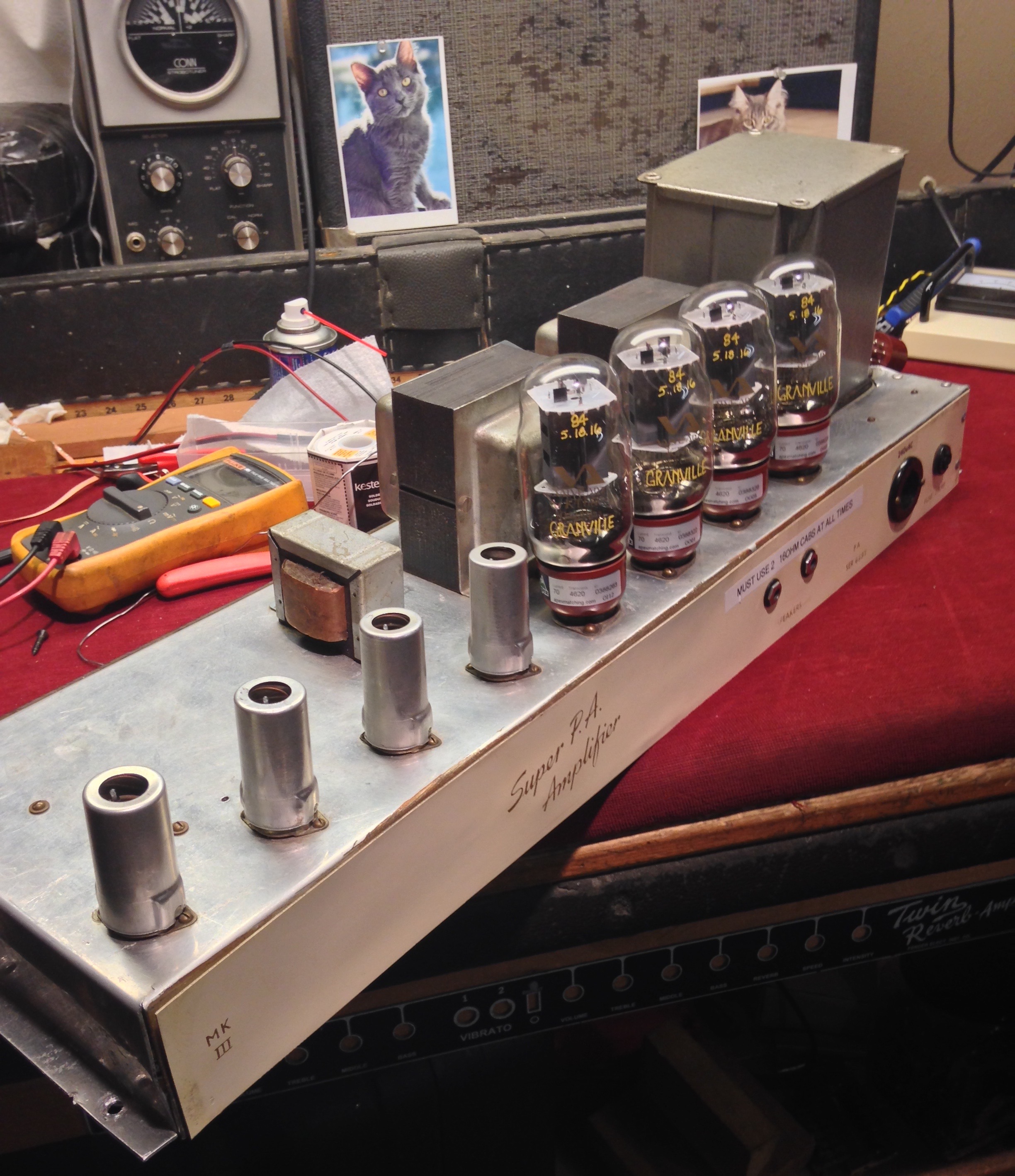 Here we see the upper side of the chassis featuring the brand new KT66 power tubes as intended in the original design. This amp has a wonderful big complex tonality. Also notice the very rare DUAL output transformers. This was necessary to obtain 100 watt performance at that time since no large enough output transformers were available.